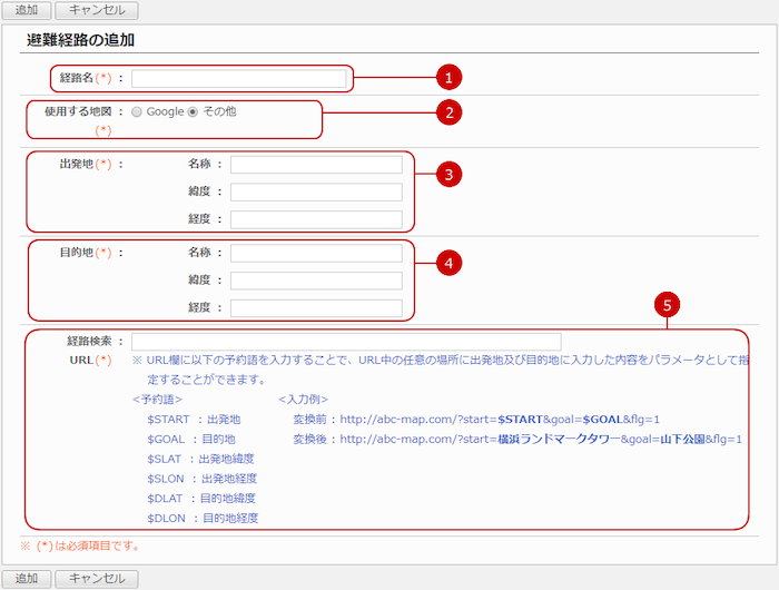 避難経路一覧画面の[避難経路の追加]ボタンを押すと、避難経路の追加画面が表示されます。