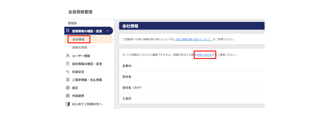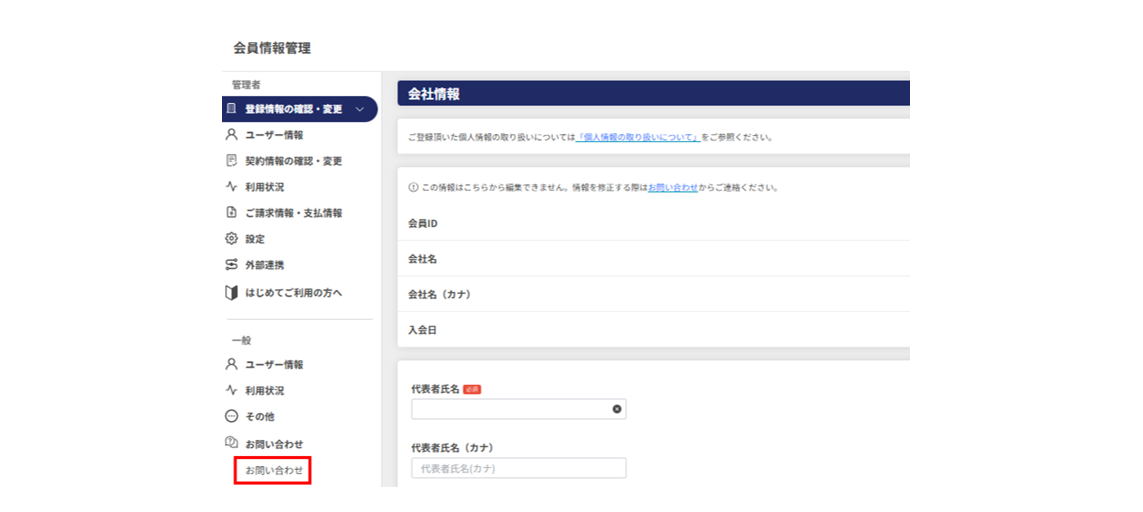• [ 管理者 ] > [ 登録情報の確認・変更 ] > [ 会社情報 ]の画面上部にございます「お問い合わせ」をクリックすると、会員様専用の問い合わせフォームに画面遷移いたします。