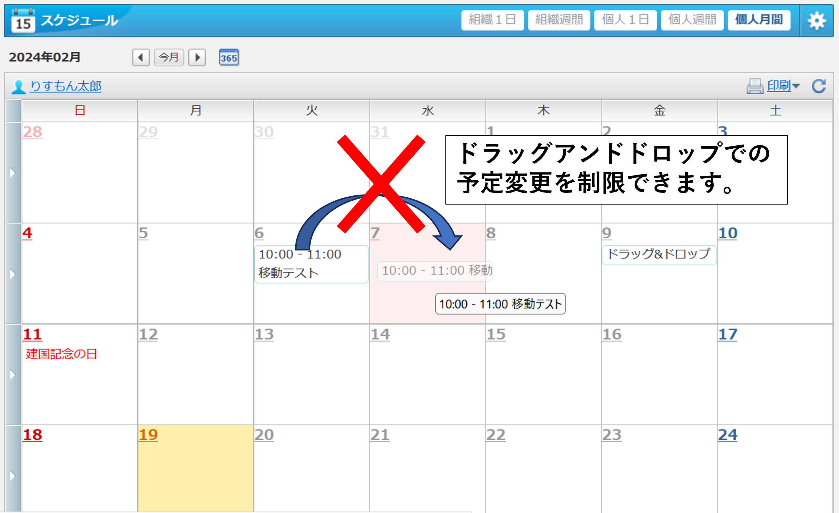 こちらの機能を利用していただくと、ドラッグアンドドロップによるユーザーの予定変更を利用不可にすることが出来ます。